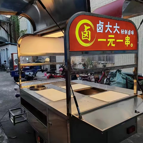 Quiosco de comida móvil de calle al aire libre, pequeño coche expendedor, pequeño camión de comida rápida de café y comida empujado a mano